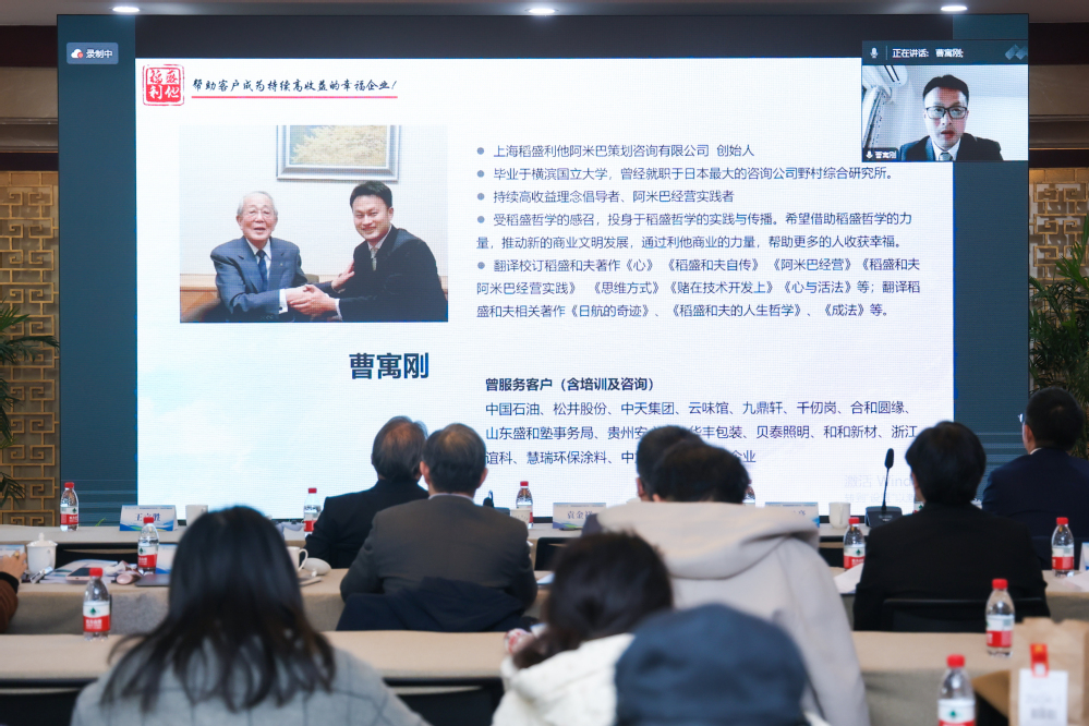 上海稻盛利他阿米巴策划咨询有限公司总经理曹寓刚从稻盛哲学的表观意义、社会效应、宇宙观意义三个方面深入解答了“稻盛哲学是什么?”这一问题,并从多个角度阐释了稻盛哲学的协调作用、科学方法、积极效能、本质内涵等内容。他为中国企业从“信、愿、行、证”四个方面理解、践行稻盛哲学提供了独特见解和丰富建议。
