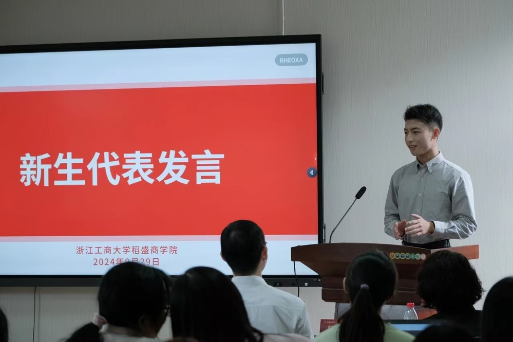 随后,两位学生代表分享了自己选择稻盛菁英班的心路历程。“数字商业”微专业学生林东方认为加入菁英班不仅是一个学习的机会,也意味着承担更多的责任,需要对自己的选择和未来的学业负责。“跨境电商+小语种”微专业学生王怡雯认为中国跨境电商市场快速增长,具有很大的发展潜力,而小语种学生在该领域具有优势,鼓励同学们带着勇气和决心一起迈向未来。