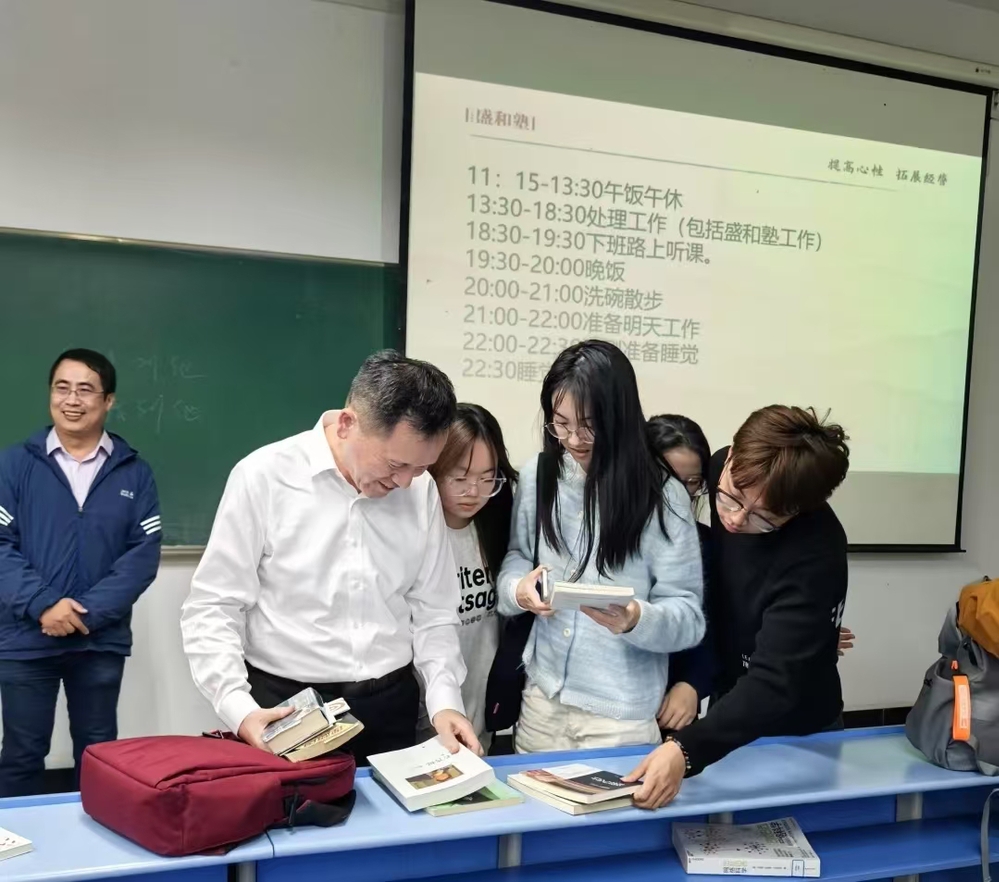 讲座后,陈总与在场同学亲切交流,热心回答了同学们提出的问题,让大家对稻盛经营学有了更深入的感悟,并向同学们赠送《稻盛和夫自传》《活法》《干法》《京瓷哲学》《阿米巴经营》《稻盛和夫的实学:经营与会计》等书籍。